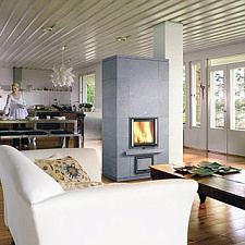 Пристенный печь-камин с задним нижним подключением 2 теплового класса, для больших помещений.